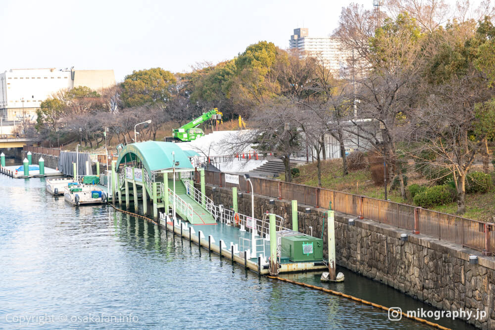 搭乘水上巴士到「大阪城港 八軒家濱港」(大阪城港 八軒家浜船着場)下船