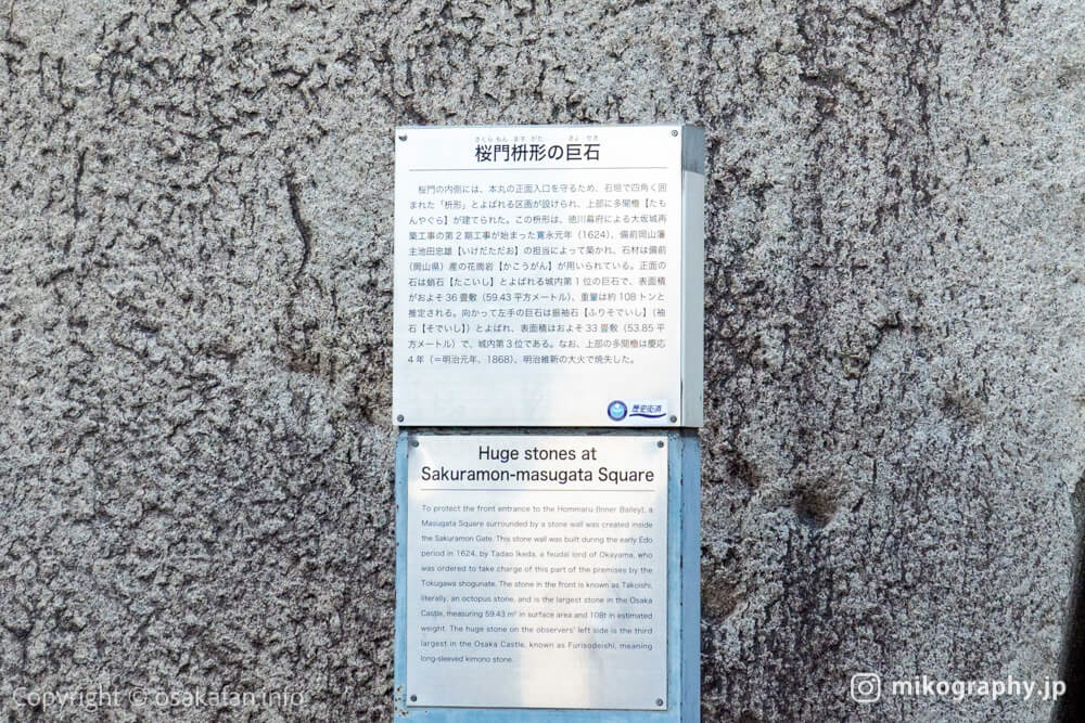 大阪城本丸正門的「櫻門」建造於德川幕府時代,經歷颱風雨大火而毀壞,今日看到的櫻門是修復於1969年,相傳是城門周遭種滿了櫻花林而因此命名。想要遙望戰史的話,櫻門正面宛如高牆的巨石「蛸石」便是一個值得造訪的景觀。「蛸」一詞在日文是章魚之意,蛸石則是因為石頭左下角有長得像章魚的紋路而得其名。而在那邊「枡形」以枡形的方式排列,枡形指的是以石牆圍成的四角形區域,敵人攻進城門時,能夠將其團團圍住攻擊的地形。而這個雄偉的蛸石也是相當有人氣的打卡點,你可以在這邊與之合照,發思古之幽情